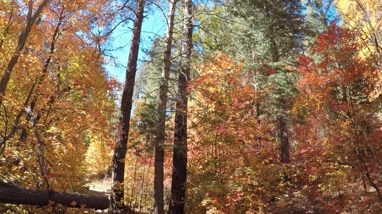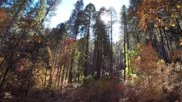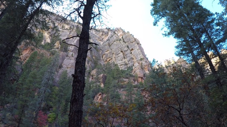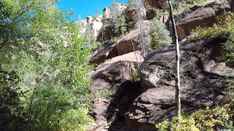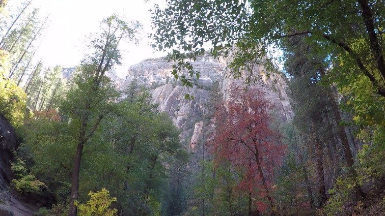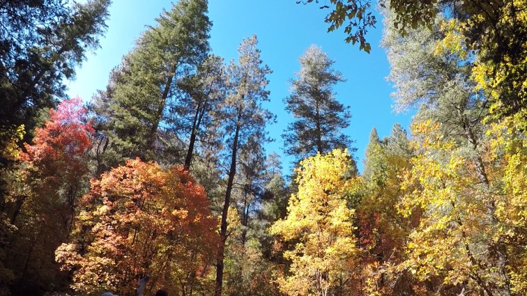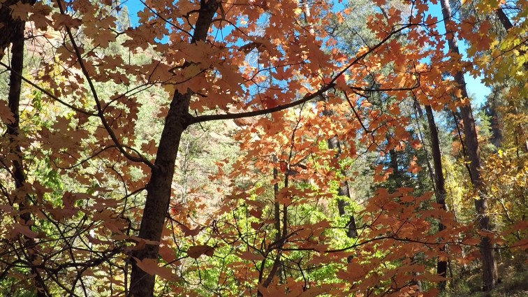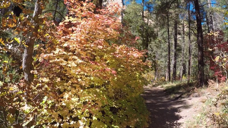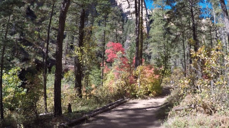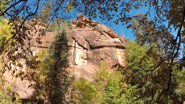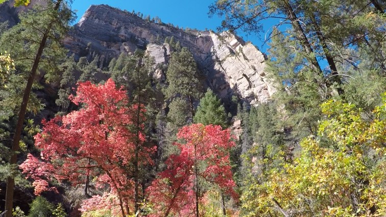 The weather was perfect (mid 80’s) and the trail lived up to its reputation for beauty. The west fork of Oak Creek wanders down out of Secret Mountain Wilderness under towering red sandstone and white limestone cliffs, some of which ascend over a thousand feet high. Fall is the most popular time for hikers as red, orange, yellow and green leaves adorn the trees that are interspersed between the tall pines making it feel like nature is throwing a festival!