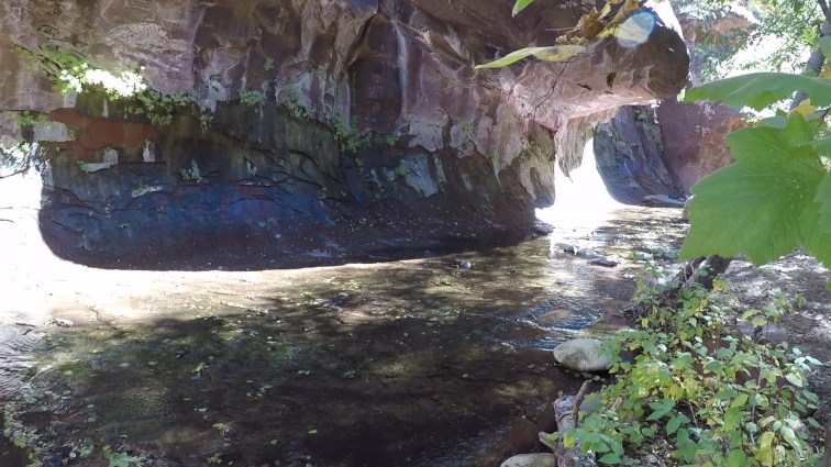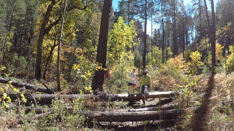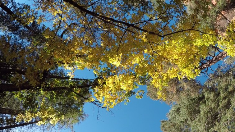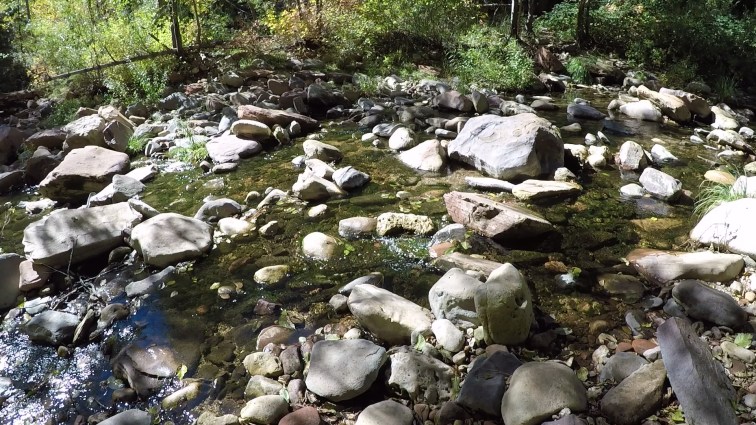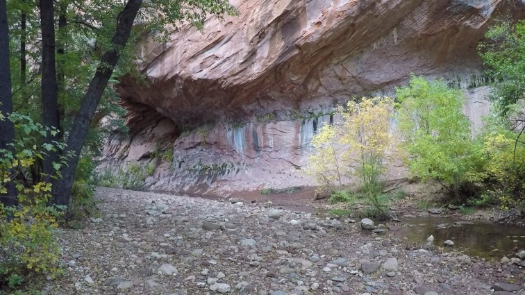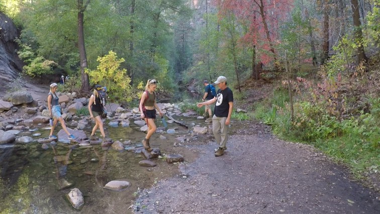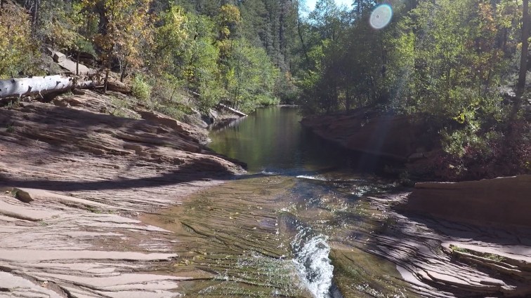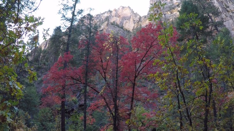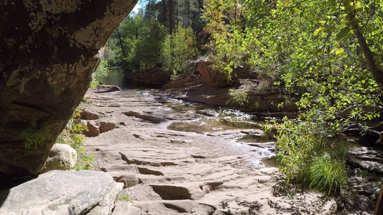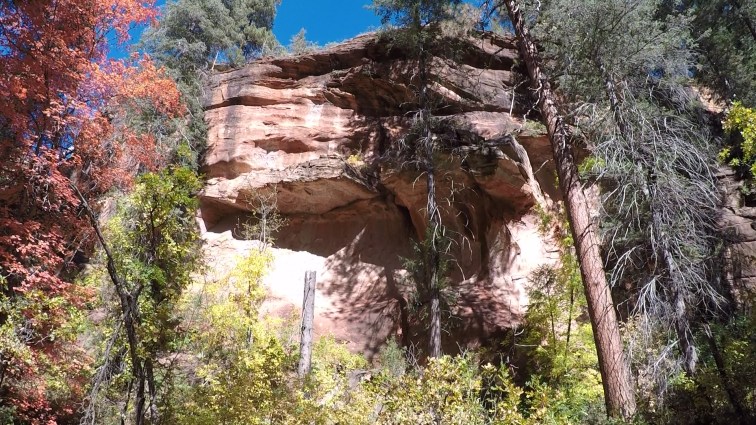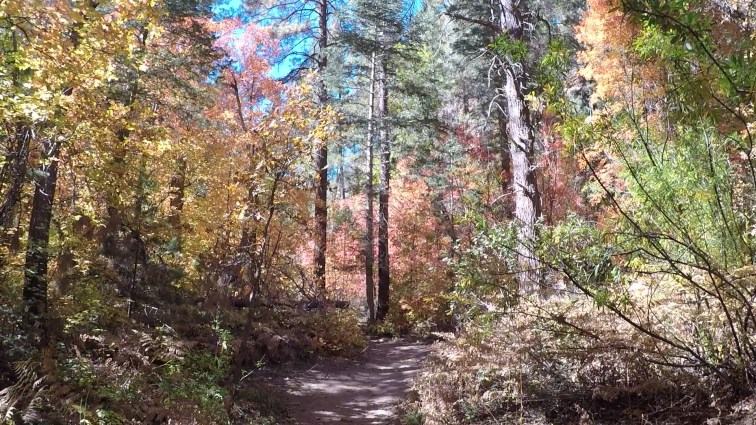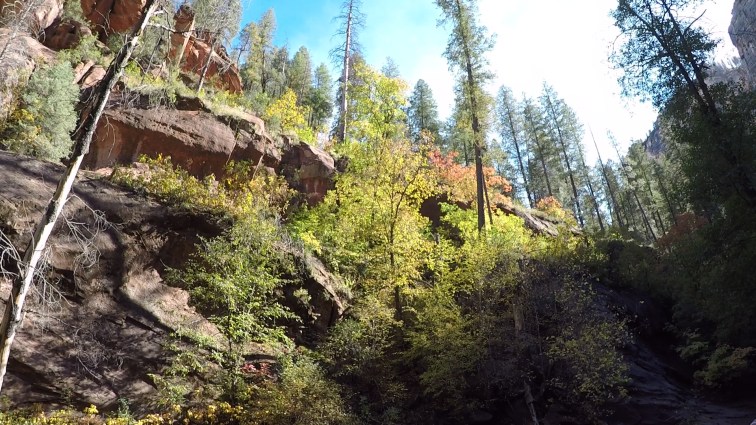 The weather was perfect (mid 80’s) and the trail lived up to its reputation for beauty. The west fork of Oak Creek wanders down out of Secret Mountain Wilderness under towering red sandstone and white limestone cliffs, some of which ascend over a thousand feet high. Fall is the most popular time for hikers as red, orange, yellow and green leaves adorn the trees that are interspersed between the tall pines making it feel like nature is throwing a festival!